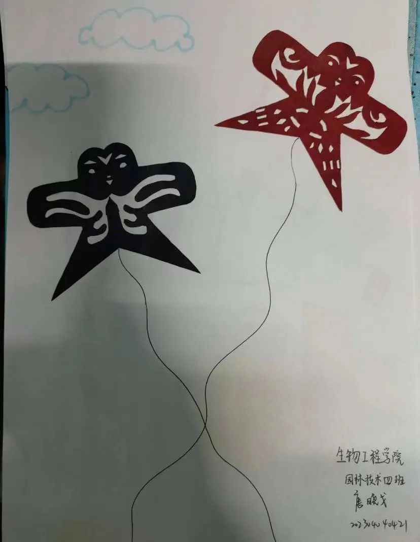 本次活动,非常考验同学们的绘画动手能力。同学们须将自己心中的风筝画到纸上,然后剪切下来粘到A4纸上,最后二次创作进行绘画完成作品。风筝在传统文化中有着独特的寓意,在此过程中同学们不仅锻炼了自己的动手能力,拓展了思维还了解了风筝独特的魅力,了解弘扬了传统文化。