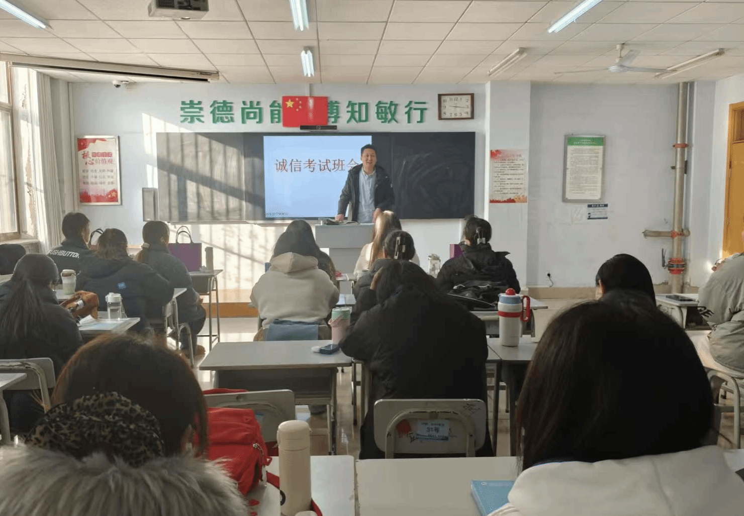 期末考试临近,为严肃考风考纪,切实加强学风建设,营造公平、公正、诚实、守信的考试环境,12月29日公司全体班主任和辅导员在二号教学楼开展诚信考试主题班会。