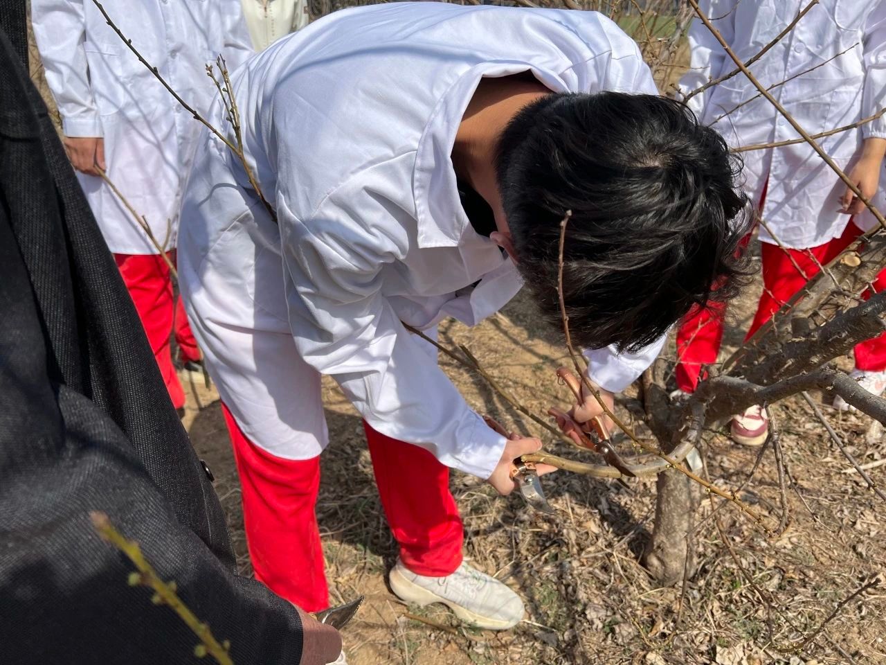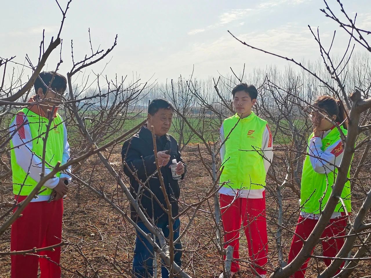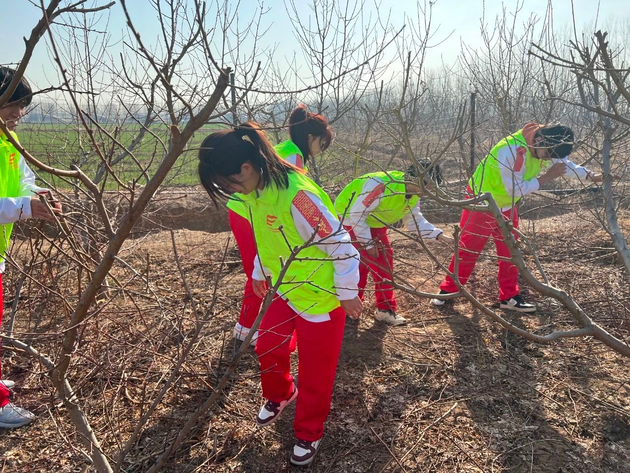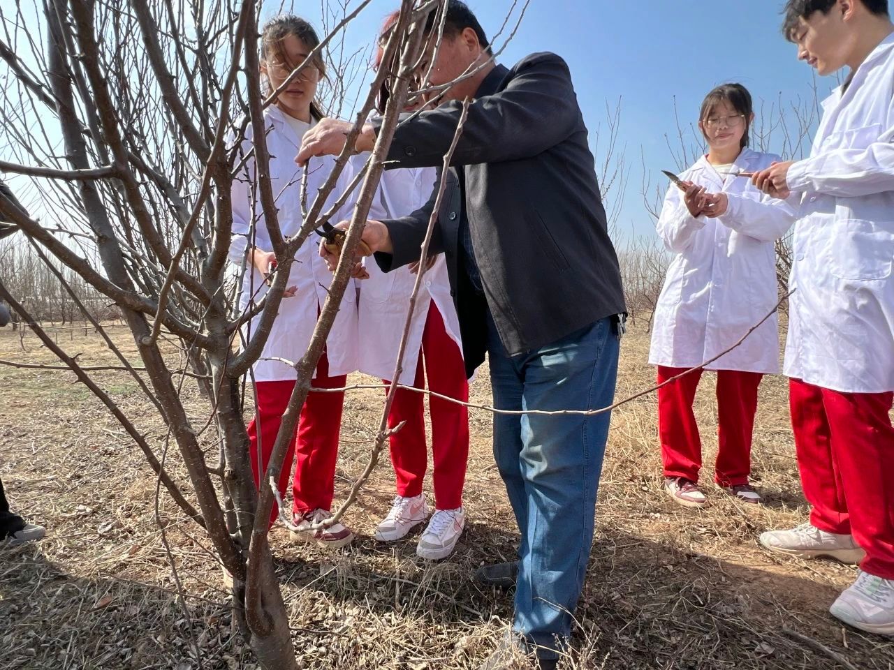 开展果树新品种培育研究、高产技术栽培,对果品产业增效、农民增收致富实现乡村振兴有着重要意义。活动中,生物学子怀着满腔热情来到惠民县农业投资发展集团特色农业种植示范基地,在技术专家的带领下,员工们认真学习了不同果树品种的分类与辨别方法以及培育的新品种的出芽情况和生长特点。了解了关于果树育种、嫁接、授粉、修剪等专业知识。当前,正是桃、杏出芽的关键时期,同学们走入果树林间,对果树枝芽小心修剪细心整理,得到了技术人员和果农们高度的赞赏。